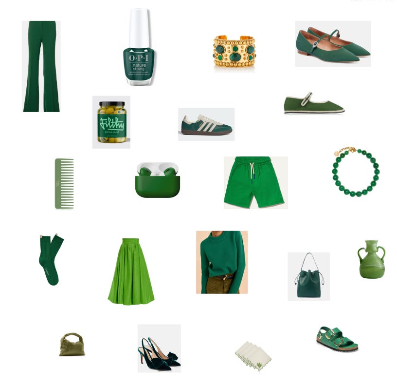 I am so ready for spring! I have wanted to basically sleep all of January and February and I don’t think I am alone. Nothing says spring like GREEN. I would argue that there is no better color than green. My home and wardrobe are both filled with the snappy color. It is happy without being too sweet. It is year round and works dressed up or down. My Nana would say it is “easy to wear and forgiving” unlike its pretty mother, yellow (yellow and blue make…). Below are some things I would throw on any day and a few useful green accessories (even for your martinis). If you want to walk into a fairytale of green, visit Found by Maja in SF. It is a healthy little green feast for the eyes.