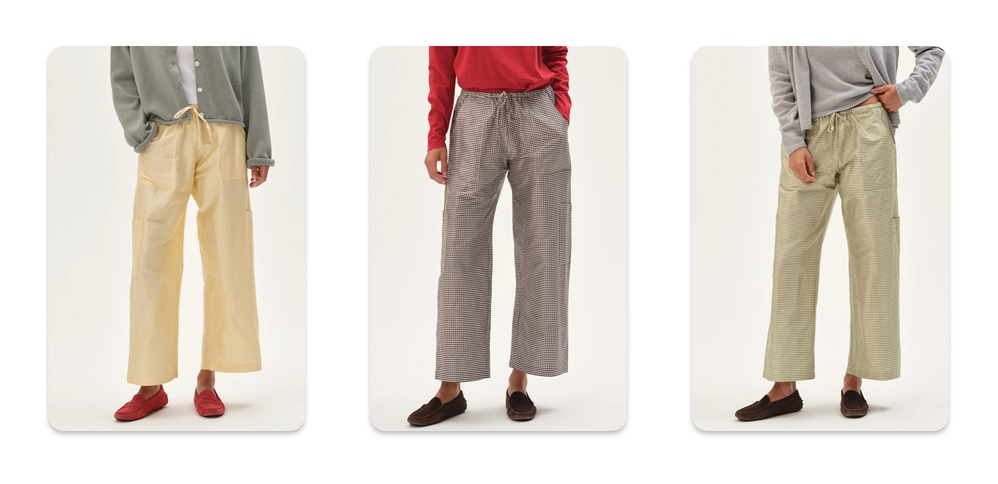 12. Donni! These pants are constantly selling out and are available for preorder. The taffeta drawstring cargo pants (with a gingham print!) are such a perfect oxymoron (taffeta plus cargo?!), elevating everyday outfits.